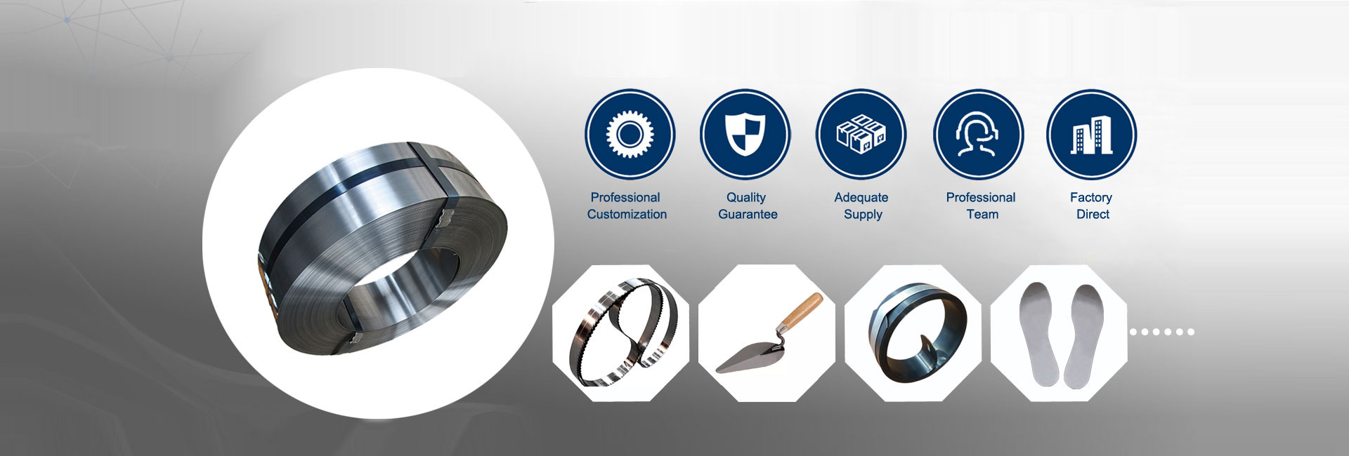 Products are widely applied in hardware tools, all kinds of clay tile, putty knife, bricklaying knife, float, shovels, woodworking band saw, saw blade, all kinds of garden saw, hand saw, saw blades, automotive clutch plate, gate rounded edge spring steel band, clock spring, lock, shoes materials, textile, sickle, standard stamping materials, there are all kinds of color packing belt, steel belt and other industries use.